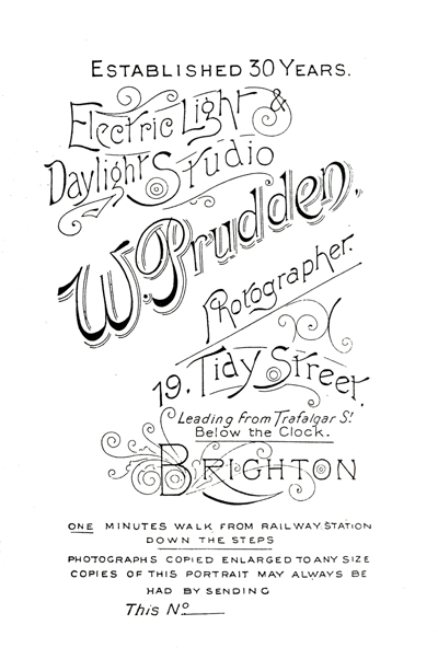 [ABOVE] An early trade plate for William Prudden, Photographer of 19 Tidy Street, Brighton (c1873). |