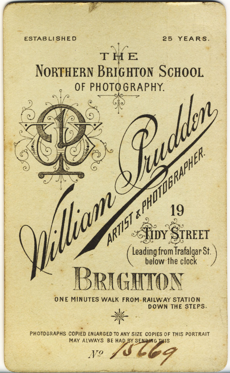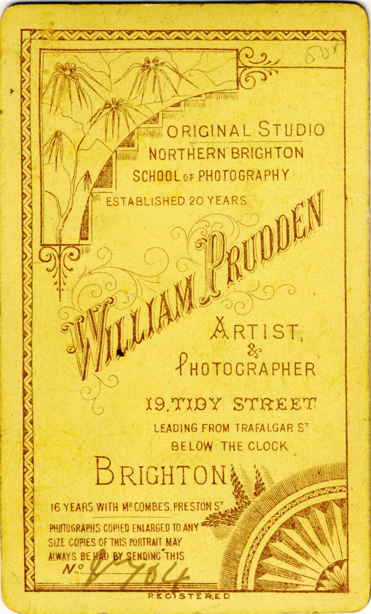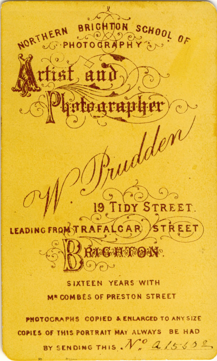 Around 1869, after 16 years of employment with Charles Combes as a general assistant, camera operator and photographer, William Prudden left Charles Combes' studio in Preston Street to set up his own photography business in Brighton. William Prudden began by working from his home at 2 West Hill Place, Brighton but he soon shifted his photographic studio to 8 West Hill Place, the former work premises of artist and miniature portrait painter, Daniel Byrne (born c1815, Dublin, Ireland). After a year or so, William Prudden moved the location of his studio to 44 Rose Hill Terrace, near Brighton's London Road. By 1873, William Prudden had established a permanent studio at 19 Tidy Street, in the North Laine district of Brighton. William Prudden was to run a studio at 19 Tidy Street, Brighton, for the rest of his photographic career, a period of nearly 37 years. |