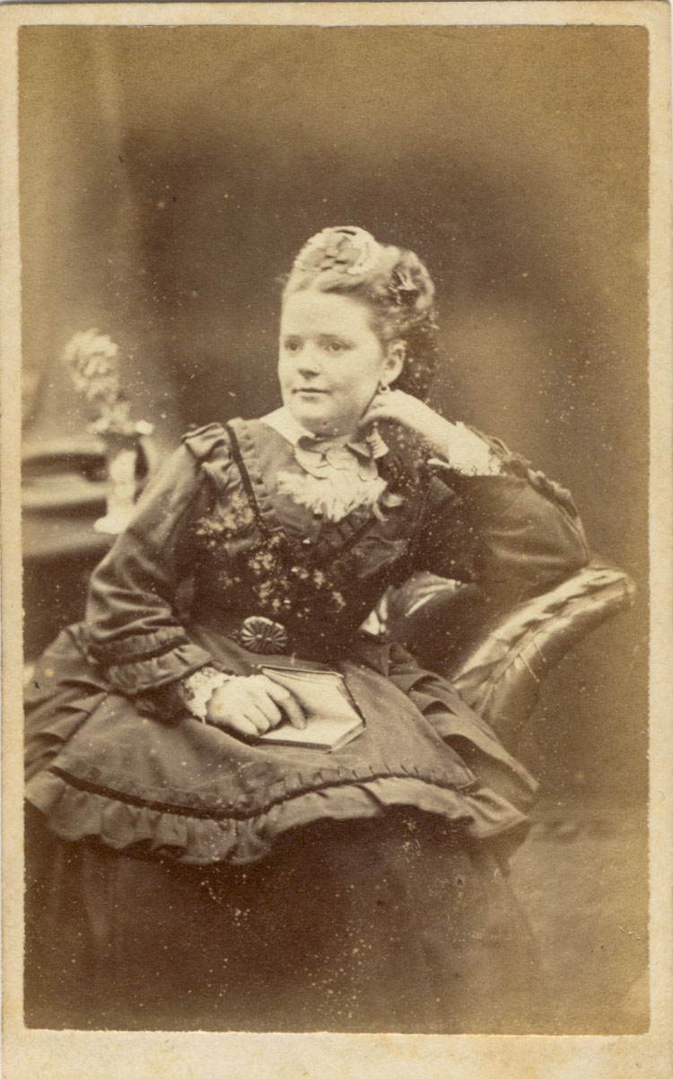 [ABOVE] Portrait of a seated woman with a book, a carte-de-visite photograph produced by William Prudden of 19 Tidy Street, Brighton (c1875). |