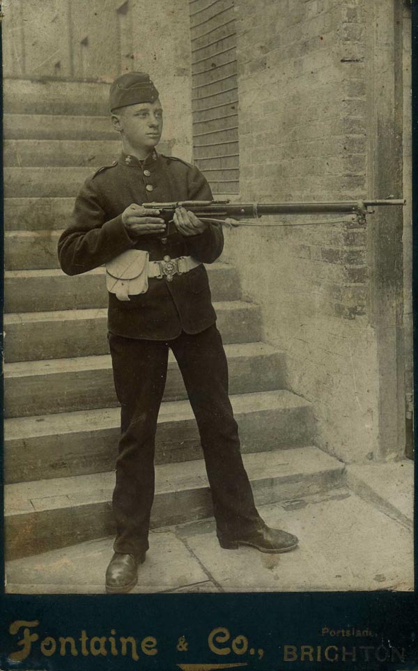 Fontaine & Co.'s Portrait of a Young Soldier Can you identify this young man's uniform ? The portrait of the young man in uniform holding a rifle (see above, left) was probably photographed around 1900 at Portslade by William Kessler (Eugene Fontaine) or his partner Fanny Fontaine. On the left, I have shown details from the photograph, showing the collar badges and the badge on the belt worn by the young soldier. If anyone viewing this page can identify the young man's uniform or regiment, or provide any further details about the photograph, would they please contact me by e-mail.