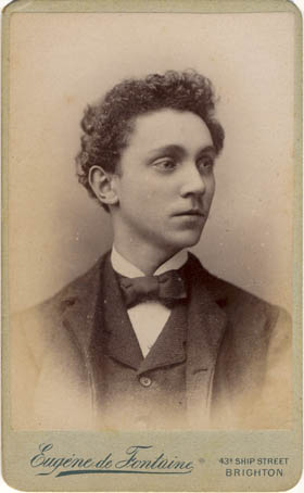 ![]() [ABOVE] A portrait of a young William Kessler (1859-1929), photographed in December 1874, shortly before he arrived in Brighton as a teenage musician. William Kessler's father, Ludwig Kessler (1834-1872) was a professional musician from Germany. From 1875, William Kessler, who was then in his teens, earned his living as a professional musician. On the evidence of this portrait, William Kessler was a trumpeter or cornet player. There is also documentary evidence that William Kessler was a "teacher of Music" and a composer of music. This portrait was taken in Tunbridge Wells in the studio of David Robert Everest at 40 Grosvenor Road, Tunbridge Wells, and is inscribed "yours faithfully, L. W. Kessler, Dec.1874". [PHOTO: COURTESY OF PETER L. KESSLER] |