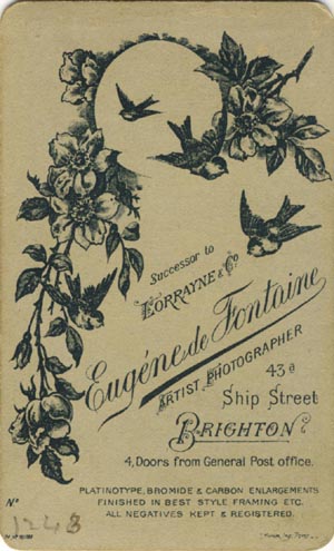 Around 1893, the name of the studio at 43A Ship Street changed from Lorrayne & Co. to Eugene de Fontaine. The new proprietor of the studio at 43A Ship Street can be identified as William Kessler as he used "Eugene de Fontaine" as a nom-de-plume for the remainder of his photographic career and this name is also entered as an alias on his death certificate. The studio of Eugene de Fontaine is listed under the heading of "Photographic Artists" in Brighton trade directories for the next three years (1893, 1894 and 1895) until it was acquired by William Hillmer (born 1849, Islington, London) around 1896. William Hillmer was based in Southampton and it is possible that he retained the services of William Kessler ("Eugene de Fontaine") as a studio manager or chief photographer in the Ship Street studio. William Hillmer's new wife, Elizabeth Mentor (born 1861,Stepney, London), had owned photographic studios in Southampton and Portsmouth before she married William Hillmer in 1894. After their marriage, the studio in Southampton continued under the name of E. Mentor & Co, but after William Hillmer purchased Eugene de Fontaine's Brighton studio around 1896, the studio went under the name of William Hillmer & Co. Between 1896 and 1900, E. Mentor & Co. (the firm of photographers established by William Hillmer's wife Elizabeth Mentor) expanded rapidly. Over a five year period, E. Mentor & Co. opened studios at Newport on the Isle of Wight, Bournemouth, Southsea, Cheltenham, Wolverhampton, Birmingham, Coventry, Kidderminster, and at Barrow-in-Furness in Cumbria. By 1899, William Hillmer's studio at 43a Ship Street, Brighton was also carrying the name of E. Mentor & Co. It is possible that William Kessler (Eugene de Fontaine) was employed by E. Mentor & Co as a photographer at their studio in Brighton until the studio closed around 1900. Interestingly, as soon as E. Mentor & Co. closed their Brighton branch studio at 43A Ship Street, Brighton. Eugene de Fontaine emerged again as a studio proprietor, this time in the Brighton suburb of Portslade.
