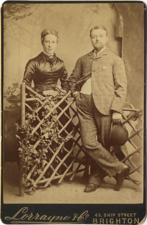 [ABOVE] A studio portrait of a couple posing by a rustic wooden fence. Cabinet photograph by Lorrayne & Co. of 43 Ship Street, Brighton (c1891). | [ABOVE] A cabinet portrait of a young man with a moustache, photographed by Lorrayne & Co. of 43 Ship Street, Brighton (c1891). |