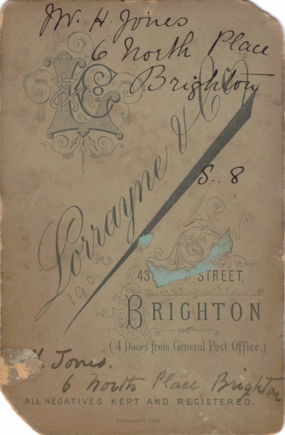 [ABOVE] A portrait of Abraham Julius Jones (born 1885, Brighton), a cabinet photograph by Lorrayne & Co. of 43 Ship Street, Brighton (c1891). Abraham Jones was the son of Betsey Marks and Henry Jones, a clothier and lodging house keeper of Brighton. Abraham had at least two siblings -Sarah Jones (born 1882, Brighton) and Ferdinand Jones (born 1888, Brighton). When this portrait of Abraham was taken the family were living at 7 Gardner Street, Brighton [1891 census]. Abraham Julius Jones went on to marry Adelaide White in Hackney, East London, on 12th February 1920 and fathered four children - Frances Beth (born 1921), Henry (born 1922), Frank Ferdinand (born 1924) and Michael John Jones (born 1934). | [ABOVE] The reverse of the cabinet portrait of Abraham Jones (pictured on the left) by Lorrayne & Co. of 43 Ship Street, Brighton. Negative No.190 E (c1891). Handwritten in ink on the card mount is the inscription: "Mr H. Jones, 6 North Place, Brighton". Henry Jones (born c1853, Brighton), the father of Abraham (the young boy depicted in the photo on the left), lived with his family at 7 Gardner Street, Brighton, but also ran a lodging house at 6 North Place, Brighton. The son of Julius Jones, a Jewish clothier from Germany, Henry Jones married Betsey (Elizabeth) Marks (born c1862, London ) in 1881. Abraham Julius Jones (born 1885, Brighton) was the second of three children born to the couple. [ Abraham's siblings: Sarah Jones (born 1882) & Ferdinand Jones (born 1888) ] |
