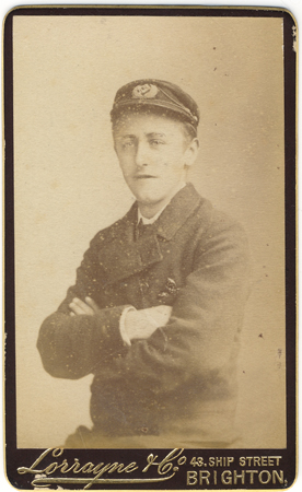 [ABOVE] A carte-de-visite portrait of a toddler, photographed at the studio of Lorrayne & Co. at 43 Ship Street, Brighton. (c1890) Negative No. 120 S | [ABOVE] A carte-de-visite portrait of a young man in uniform, photographed at the studio of Lorrayne & Co. at 43 Ship Street, Brighton. (c1890). Negative No.125 M | [ABOVE] The reverse of the carte-de-visite portrait of a young man in uniform by Lorrayne & Co. shown on the left. The back is inscribed "Francis with Henry's Best Love". |