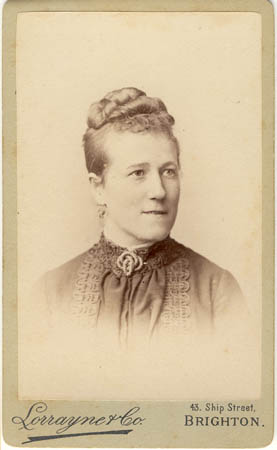 [ABOVE] A carte-de-visite portrait of an unknown woman, photographed at the studio of Lorrayne & Co. at 43 Ship Street, Brighton. Negative No. 165 M (c.1891) |