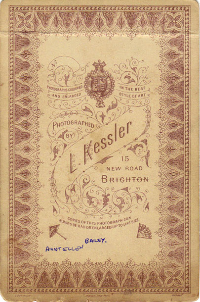 Portrait of Ellen Bailey, photographed by "L. Kessler" at William Kessler's Studio in New Road, Brighton |