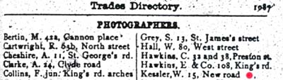 By 3rd September 1883, William Kessler was living in the centre of Brighton at 15 New Road, close to the Theatre Royal and a few doors away from the Oxford Music Hall of Varieties. Sometime between 1883 and 1887, William Kessler and his wife Eliza separated. It appears that Eliza Kessler left Brighton for London, taking her three eldest children with her. In 1883, the business premises at 15 New Road, Brighton was used as a tobacconist's shop by Mrs Rosina Streete, a 51 year old widow. In 1887, Mrs Streete allowed the room above her shop to be used as a photographic studio by one of her tenants. Page's Brighton Directory of 1888, lists Louis Kessler, a photographer, alongside Mrs Streete, tobacconist, at 15 New Road, Brighton. William Kessler appears to have adopted the first name of Louis for his photographic activities. (Pike's 1888 Directory of Brighton lists "W. Kessler" as the photographer in business at 15 New Road, Brighton). While he was using the upstairs room at 15 New Road as a studio, William Kessler was residing at 72 Lewes Road, Brighton. By the start of 1889, the studio of "Louis Kessler" at 15 New Road, Brighton, had been sold to the photographer Robert Armitage.
