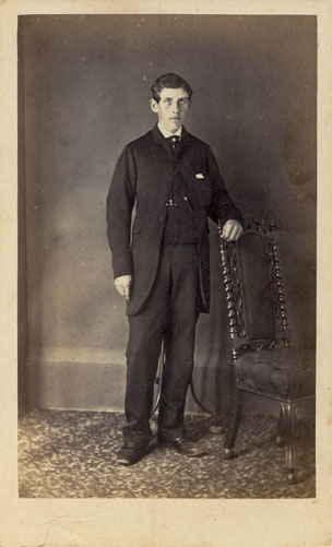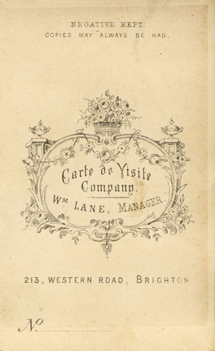[ABOVE] A full-length portrait of a young woman, photographed around 1862 at the Carte de Visite Company studio at 213 Western Road, Brighton. The reverse of the cdv is inscribed with the name "Minnie" and carries the Negative No. 2496. | [ABOVE] The trade plate of the Carte de Visite Company, 213 Western Road, Brighton, taken from the reverse of a carte-de-visite portrait (c1862). William Lane is identified as the Manager of the Company. Photographic negatives were kept so customers could order further copies. | [ABOVE] A full-length portrait of a young man leaning on a chair photographed around 1862 at the Carte de Visite Company studio at 213 Western Road, Brighton. The reverse of this carte-de-visite portrait carries the Negative No. 2485. | [ABOVE] A full-length portrait of a young woman posing in front of a painted backdrop. This portrait was taken around 1862 at the Carte de Visite Company studio at 213 Western Road, Brighton. The space reserved for the photograph's negative number has been left blank. |