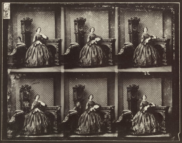 [ABOVE] An uncut proof sheet containing 6 carte-de-visite portraits of a fashionable young lady (1861). In the 19th century, photographers utilised specially designed multi-lens cameras which could capture between four and a dozen images on a single photographic plate. A contact sheet produced from a single glass negative plate could be cut up to produce a set of small photographic cards measuring 2 1/2 inches by 4 1/4 inches or 6.3 cm by 10.5 cm. | [ABOVE] A young woman photographed in two different poses at a single sitting at William Lane's studio in Queen's Road, Brighton. For carte-de-visite portraits it was quite common for 6 or 8 photographs to be taken on a single plate, each one featuring a different pose. In the photograph on the left, the young woman holds a photograph album on her lap, but for the second photograph, the album has been placed on the occasional table. |