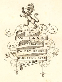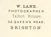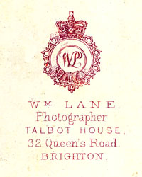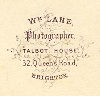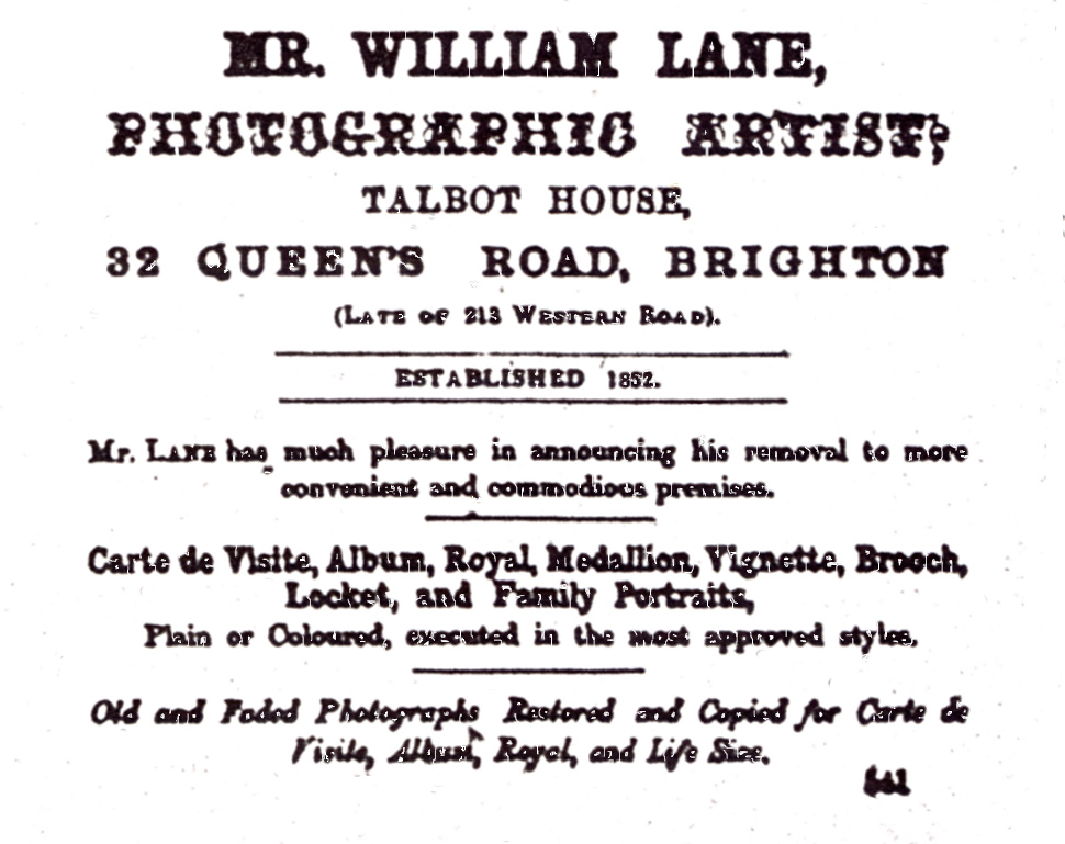 Around 1863, William Lane opened a new photographic portrait studio in Brighton's Queen's Road, a busy thoroughfare which ran southwards from the town's Railway Station; the road eventually leading to West Street and Brighton's seafront. An advertisement in the 1864 edition of Folthorp's General Directory of Brighton, declared that "Mr. Lane has much pleasure in announcing his removal to more convenient and commodious premises" at Talbot House, 32 Queens Road, Brighton. In the same advertisement William Lane informed the public that his new Talbot House studio he could provide a wide range of photographic portraits including "Carte de Visite, Album, Royal, Medallion, Vignette, Brooch, Locket, and Family Portraits". Lane added that all these portraits could be provided "Plain or Coloured".