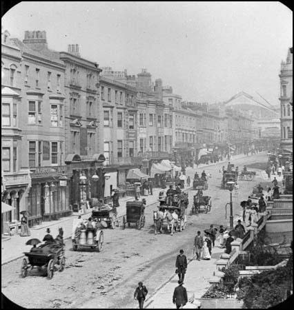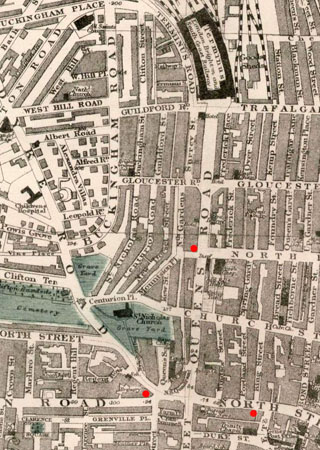 [ABOVE] A 19th century map showing the location of William Lane's studios in Brighton at 213 Western Road, No. 401/2 North Street and 32 Queen's Road. | [ABOVE] A late 19th century photograph of Queens Road, a busy thoroughfare which ran south from Brighton's Railway Terminus, leading to West Street and Brighton's seafront. William Lane opened his studio at 32 Queen's Road in 1863 | The location of William Lane's photographic studio at 32 Queen's Road. Lane's business premises was at the junction with North Road. |