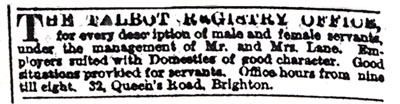 Around the year 1867, to supplement his main income as a "Photographic Artist", William Lane had established a 'Servants' Registry' (a sort of employment agency for domestic servants) under the name of The Talbot Registry Office. The Servants' Registry' was managed by Mrs Caroline Lane, William's wife, who styled herself as the Matron of The Talbot Registry Office. Mrs Lane was assisted by her youngest daughter, Dora Lane, who took on the role of 'Secretary' at the The Talbot Registry Office.