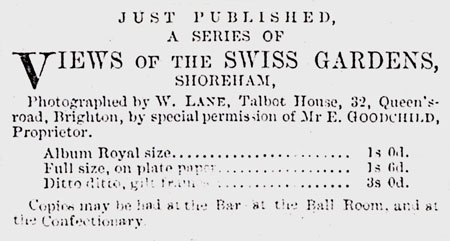 [ABOVE] Advertisement for Views of the Swiss Gardens, Shoreham, photographed by William Lane of Talbot House, 32 Queen's Road, Brighton. (Brighton Guardian, 20th September 1864 ). | [ABOVE] A photographic view of the Swiss Gardens, Shoreham by an unknown photographer. Similar views photographed by William Lane were sold at various places inside the Swiss Gardens amusement park. |
