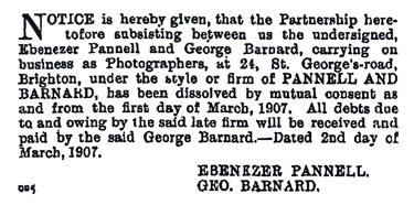 When Frederick James Holden, Ebenezer and Fanny Pannell's partner in the firm of Pannell & Holden, decided to return to Burgess Hill around 1906, Ebenezer Pannell invited his studio manager George Barnard to join the firm as a partner. George Barnard was born in Brighton or Hove around 1877. As a young man, Barnard found work as a "Photographic Printer" in Liverpool. In 1902, while living in the Toxteth district of Liverpool, George Barnard married a local dressmaker named May Russell (born 1875, Burton-on-Trent, Staffs). In 1904, George and May Barnard became the parents of a baby boy named George Gordon Barnard (born 1st Qtr of 1904, Toxteth Park, Liverpool). Around 1905, George Barnard returned to Brighton to work as a photographer for Ebenezer Pannell. A year or so later, George Barnard joined the firm as a partner and from 1906, the photographic studio at 24 St George's Road, Brighton went under the name of Pannell & Barnard. The partnership between Ebenezer Pannell and George Barnard was dissolved by mutual consent on 1st March 1907. Under the terms of the dissolution, the photographic studio at 24 St George's Road, Brighton, was retained by George Barnard. The agreement signed by Ebenezer Pannell and George Bernard on 2nd March 1907, clearly states that "all debts due to and owing by the said firm" (Pannell & Barnard of 24 St George's Road, Brighton) were to be "received and paid by the said George Barnard". During the 3rd Quarter of 1908, George Barnard's wife gave birth to a second child, a boy named Roy Mayne Barnard. When the 1911 census was taken, George Barnard and his family were recorded at living quarters attached to the photographic studio at 24 St George's Road, Brighton. On the census return, George Barnard is described as a thirty-three year old "Photographic Artist" and his place of birth is given as Hove, Sussex. Also recorded on the 1911 census return is George's wife, thirty-six year old May Barnard, and their two young sons, seven year old George Barnard junior and two year old Roy Mayne Barnard. (Another son, Eric Barnard, was born in Brighton during the 2nd Quarter of 1913). Although it is apparent from a dissolution of partnership notice published in The London Gazette that Ebenezer Pannell and George Barnard went their separate ways in March 1907 (see the copy of the Notice illustrated on the left), it appears that Barnard continued to produce photographs under the name of Pannell & Barnard up until the end of the First World War.