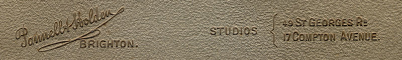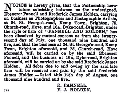 From about 1901 until 1905, Ebenezer Pannell and his sister Frances Pannell were in a business partnership with a young Sussex photographer named Frederick James Holden. Frederick James Holden was born at Pulborough, Sussex, in January 1873, the son of Harriet and Frederick Holden, a railway signalman. During the early 1890s, when he was just a teenager, Frederick Holden was employed as a photographer’s assistant in one of Ebenezer Pannell’s studios. The 1891 census records Frederick Holden as an 18 year old "Photographer" at 28 Sudeley Place, Brighton, one of the two studios operated by Ebenezer Pannell and his sister Frances Pannell. At the time of the 1891 census, Ebenezer Pannell was residing with his wife and children at 49 St George's Road, Brighton and eighteen year old Frederick Holden was lodging with Miss Fanny Pannell at 28 Sudeley Place, Brighton. Around 1895, Frederick Holden established his own photographic studio at 6 Bank Buildings, Burgess Hill, West Sussex. In 1900, after four years as a photographer in Burgess Hill, Frederick Holden was invited to join his former employer in a business partnership, to trade under the name of Pannell & Holden. The firm of Pannell & Holden opened two studios in the space of two years, one at 16 Dyke Road, Brighton, the other at Pannell’s new residence at 17 Compton Avenue in the Fiveways area of Brighton. By 1901, the firm of Pannell & Holden was operating three studios in Brighton. Ebenezer Pannell and his young business partner Frederick James Holden (born 1873, Pulborough, Sussex), with the assistance of Pannell's older sister Frances "Fanny" Pannell (born 1851, Brighton) managed studios at 49 St George's Road, 16A Dyke Road and 17 Compton Avenue, Brighton. It appears that the firm of Pannell & Holden was jointly owned by these three photographers. When the 1901 census was taken, all three photographers were recorded at 17 Compton Avenue, Brighton. Ebenezer Pannell, his older sister Fanny Pannell and Frederick James Holden are each described on the census return as "Photo Artists" and "Employers".