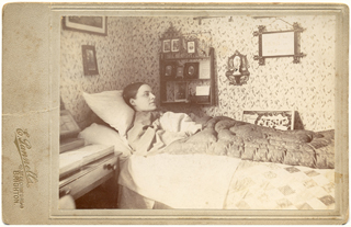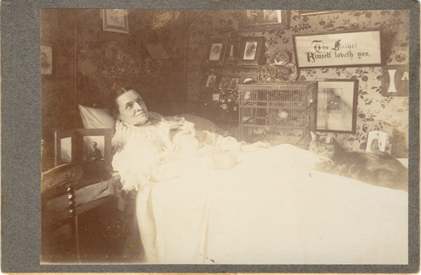 [ABOVE] Portrait of an unknown woman in her sickbed, photographed at the subject's home by Ebenezer Pannell of Brighton (c.1900). This cabinet photograph, carries the trade plate "E. Pannell, 49 St George's Road, Brighton". [Photograph from the collection of William A. Fox] |