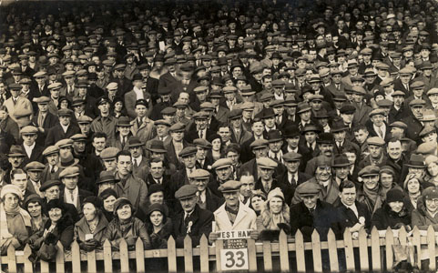 [ABOVE] A section of the home crowd at the FA Cup game between Brighton & Hove Albion F. C. and West Ham United at the Goldstone Ground on Saturday 18th February 1933. The game was drawn 2-2 These football fans were probably photographed by George Wiles, who was then a partner in the firm of Deane, Wiles & Millar. The photographer's board displays the number of the photograph (No. 33) and the name of the photographic firm which produced the picture postcard - Deane, Wiles & Millar. |