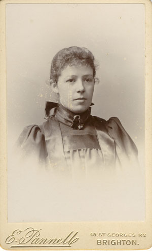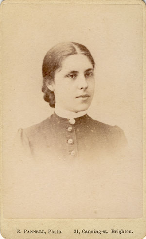 | [ABOVE] Reverse of a carte-de-visite portrait produced by Ebenezer Pannell, Photographic Artist, 49 St George's Road, Brighton. (c1889) | [ABOVE] Carte-de-visite portrait of a young woman by Ebenezer Pannell, 49 St George's Road, Brighton. (c1901). Negative No. D1728. | [ABOVE] Carte-de-visite portrait of a young woman by Ebenezer Pannell, 49 St George's Road, Brighton. (c1889). |