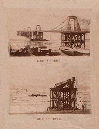 [ABOVE] Two photographs of Brighton's Chain Pier by Ebenezer Pannell of 49 St George's Road, Brighton (1896). The two photographs, one captioned "DEC 4th 1896", the other entitled "DEC 5th 1896", are supposed to to show the Chain Pier as it appeared (top) before the great storm of 4th December 1896 and (bottom) as a complete wreck the day after the violent storm destroyed the old iron pier. These two photographs by Ebenezer Pannell were mounted on a stiff card and sold to the general public to commemorate the destruction of the Chain Pier. The card mount carries the photographer's credit "E. PANNELL. PHOTO. BRIGHTON"
