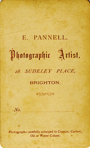 In 1881 Ebenezer Pannell was probably employed as a photographer in one of Brighton’s many photographic portrait studios. (In 1881, there were over thirty photographic studios in Brighton). By 1883, Ebenezer Pannell was running his own photographic studio at 21 Canning Street, Brighton. Canning Street was in the residential area north of Kemp Town’s Eastern Road, close to the Sussex County Hospital (now the Royal Sussex County Hospital). A carte-de-visite portrait of an elderly man, photographed by Ebenezer Pannell at 21 Canning Street, Brighton, carries on the reverse of the carte a printed date of "Nov. 19th 1883", which helps to date Ebenezer's entry into professional photography. As Ebenezer Pannell was not based in the central commercial district of Brighton, his name does not appear in the list of professional photographers published in Brighton trade directories between 1883 and 1887. It was not until 1888, when he established a photographic studio at 28 Sudeley Place, Brighton, that Ebenezer Pannell was first entered in a Brighton trade directory as a professional photographer. The 1888 edition of Pike’s Directory of Brighton & Hove lists E. Pannell as a photographer at 28 Sudeley Place, Brighton. Located in the heart of Brighton’s Kemp Town, Sudeley Place is a small street immediately south of the Royal Sussex County Hospital and runs down from Eastern Road to St George’s Road. Before the end of the year, Ebenezer Pannell opened a second studio in St George’s Road, one of Kemp Town’s main shopping streets. Page’s Brighton Directory of 1888 lists Ebenezer Pannell as a photographer at 28 Sudeley Place and 53 St George’s Road, Brighton. The following year, Pike’s 1888 Directory of Brighton & Hove lists Ebenezer Pannell as a photographer at 49 St George’s Road, Brighton, where he was to remain for the next 15 years or so.