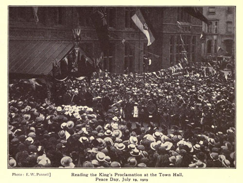| [ABOVE] "Reading the King's Proclamation at the Town Hall, Peace Day, July 19th, 1919", one of the photographic illustrations provided by Ebenezer William Pannell for the book "Hove and the Great War" by Henry M. Walbrook (1920). | [ABOVE] "Peace Day Celebrations- Procession of Ex-Service Men passing the Town Hall", another of the photographic illustrations provided by Ebenezer William Pannell for the book "Hove and the Great War" by Henry M. Walbrook (1920). |