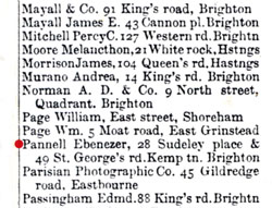[ABOVE] Extract from the trades section of the 1913 edition of Kelly's Directory of Sussex, listing the studios associated with Ebenezer Pannell and his son Ebenezer William Pannell. When this listing of photographic studios was published in 1913, Ebenezer Pannell senior was based in Church Road, Hove, while his son Ebenezer William Pannell managed photographic studios in Burgess Hill and Haywards Heath. |