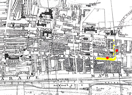 [ABOVE] A map of Eastern Brighton showing the location of Ebenezer Pannell's two photographic studios in Kemp Town - 49 St George's Road and 28 Sudeley Place, Brighton. |