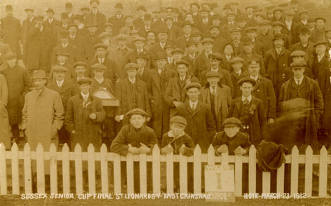 [ABOVE] A section of the crowd at the Sussex Senior Cup Final between St Leonards and East Grinstead at the Goldstone Ground in Hove on 23rd March 1912. These football fans were photographed by George A. Wiles of Hove. The photographer's board displays the identifying number of the photograph and the name and business address of the photographer - Wiles of 33 George Street, Hove. [See detail at right] |