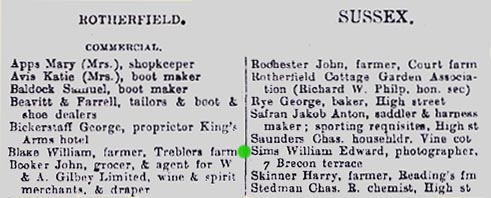 [ABOVE] An extract from the 1905 edition of Kelly's Directory of Sussex showing William Edward Sims listed as a photographer at 7 Brecon Terrace, Rotherfield in the Commercial section of the directory entry for Rotherfield. Previously, William Edward Sims worked as a photographer from an address in Church Road, Rotherfield. |