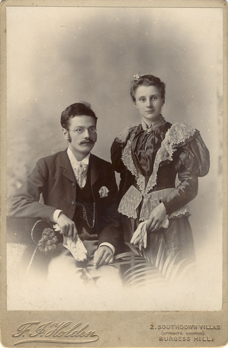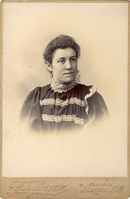 | [ABOVE] A cabinet portrait of a young couple by Frederick James Holden, No.2 Southdown Villas, opposite church, Burgess Hill, Sussex (c1899). | [ABOVE] A cabinet portrait of a young woman by Frederick James Holden of Church Road, Burgess Hill, Sussex (c1900). |