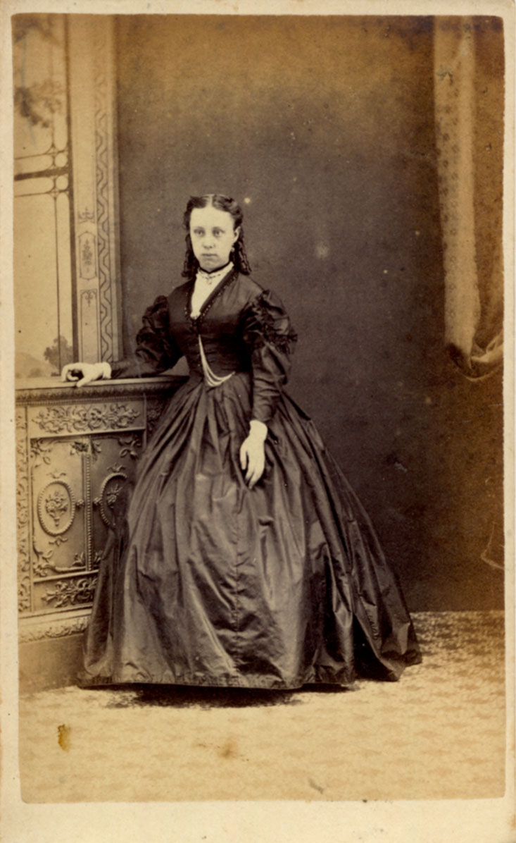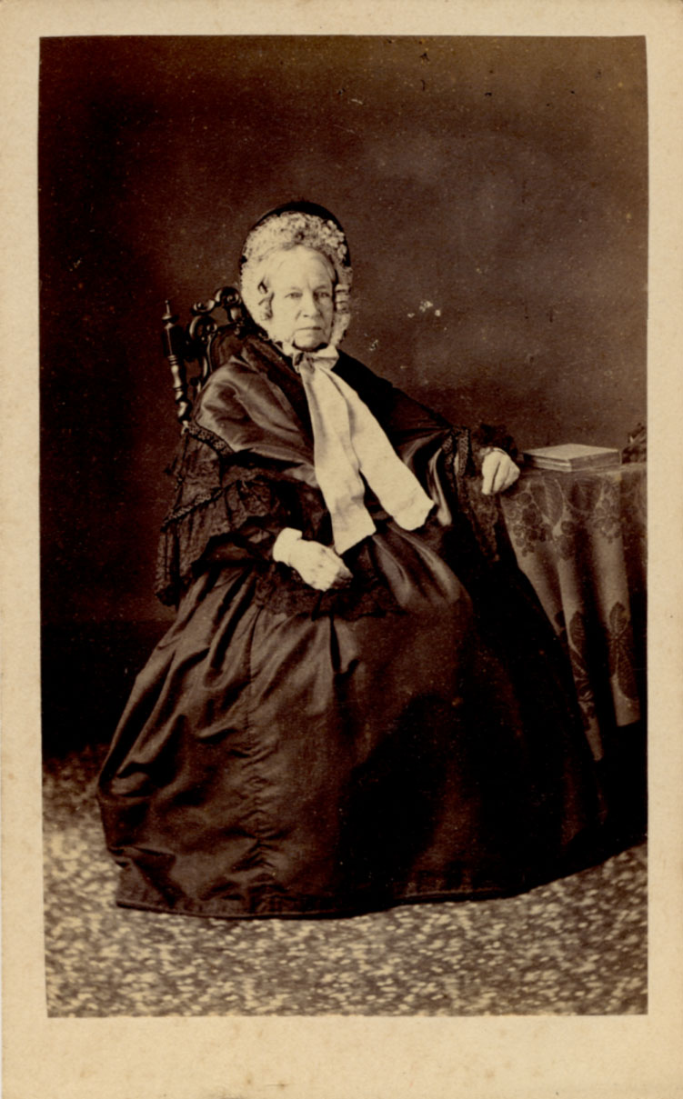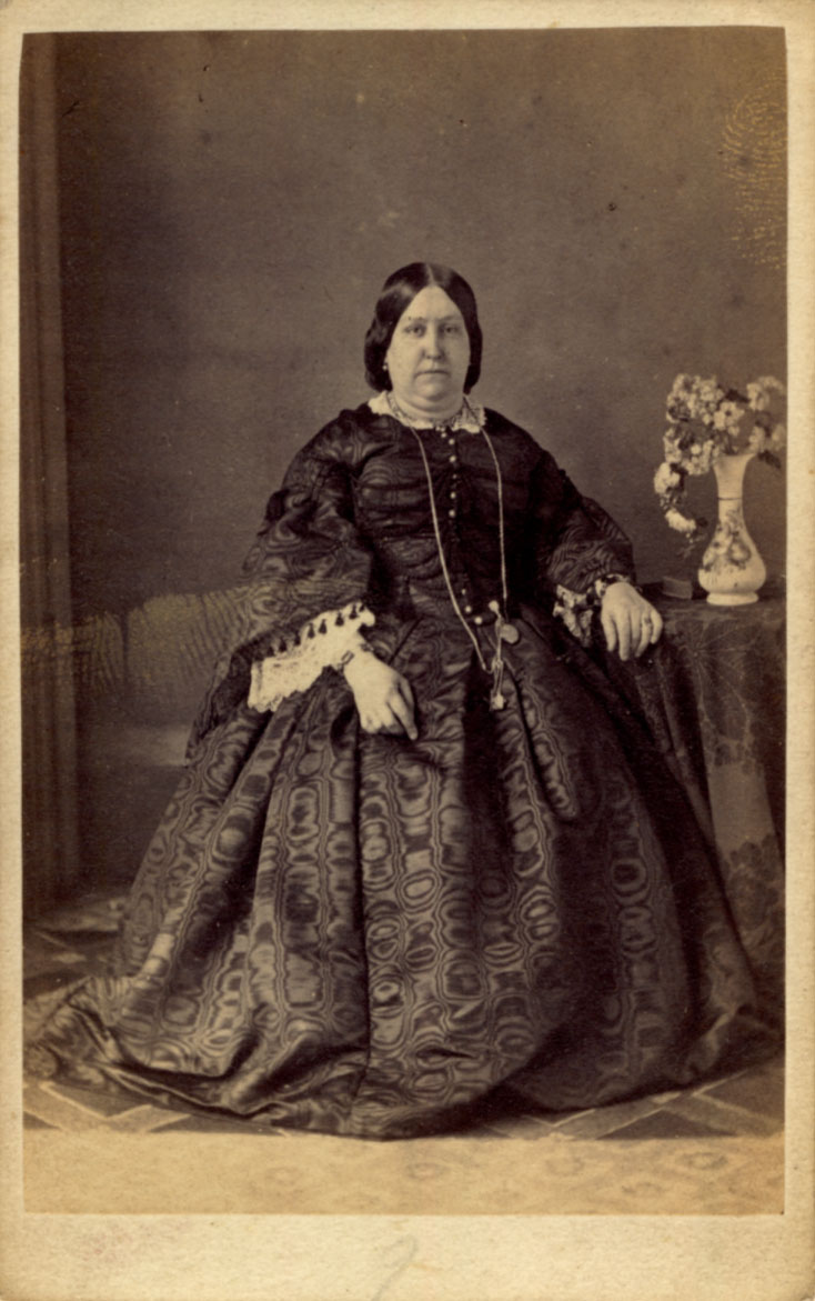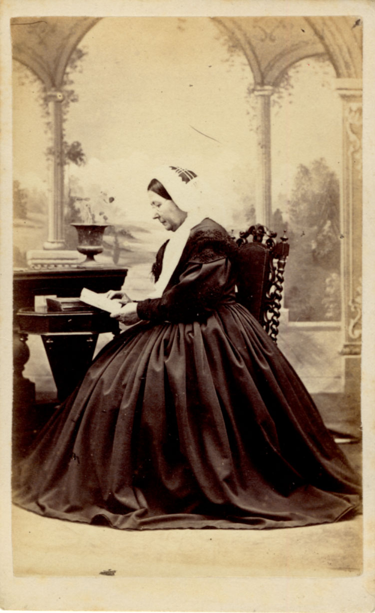 [ABOVE] A portrait of an elderley woman seated at a table, photographed by the Carte de Visite Company, 213 Western Road, Brighton (c1861). The Carte de Visite Company was managed by William Lane during the period 1861-1862. | [ABOVE] A portrait of a stout woman seated at a table photographed by William Lane of 213 Western Road, Brighton (c1862). The Brighton photographer William Lane was based at 213 Western Road, Brighton from 1853 to 1862. | [ABOVE] A portrait of a young woman standing by an elaborated decorated cabinet, a carte-de-visite photograph by William Lane of Talbot House, 32 Queen's Road, Brighton (c1865). | [ABOVE] A woman in profile reading a letter at her writing desk, a carte-de-visite photograph by William Lane of Talbot House, 32 Queen's Road, Brighton (c1863). The Brighton photographer William Lane moved to 32 Queens Road, Brighton in 1863. |