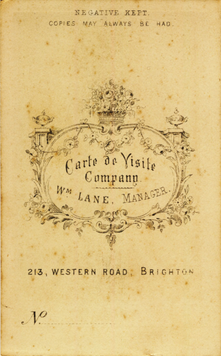 [ABOVE] The trade plate of the Carte de Visite Company, 213 Western Road, Brighton (c1861). The Carte de Visite Company was managed by William Lane during the period 1861-1862. | [ABOVE] The trade plate of William Lane of 213 Western Road, Brighton (c1862). William Lane began taking carte-de-visite portraits at 213 Western Road, Brighton in 1861. |