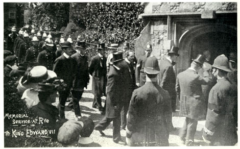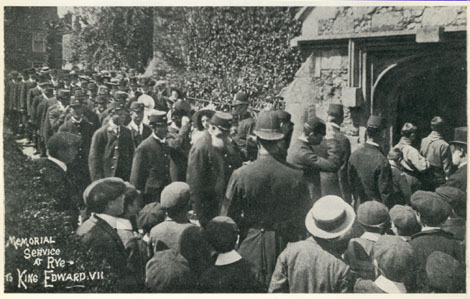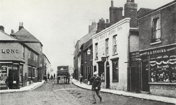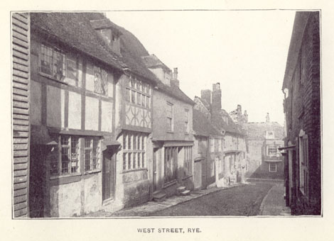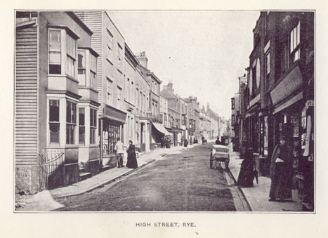 Cinque Ports Street, Rye [RIGHT] A view of Cinque Ports Street, Rye, photographed by Arthur Henry Homewood around 1905. Edwin Whiteman opened a photographic studio in Cinque Ports Street around 1895 and was based in this street for the next twenty years. On the right of this picture of Cinque Ports Street is the shop of Mrs Emma Eliza Stocks (born 1846, Rye), confectioner and tobacconist. Mrs Stocks also ran a tea room on the same premises and a painted sign proclaiming "Teas & Light Refreshments" can be seen beneath the shop window. Mrs Stocks established her business in Cinque Ports Street after her husband Felix Stocks, a Rye carpenter, died in 1897. Next door to Mrs Stocks' shop is the King's Arms Inn, a licensed public house which was run by Moses Hoad (born c1853, Hurstmonceux) from about 1899 until the inn closed around 1910. At the junction with Ferry Road, opposite the King's Arms Inn, is the business premises of Longley the grocer. Isaac Longley (1844-1899) established a grocer's shop at No 1 Ferry Road around 1866. After his death in 1899, the grocery business at the junction with Cinque Ports Street was operated by his widow Mrs Elizabeth Ann Longley (born c1842 Ashford). By 1905, the business was managed by Elizabeth's sons - Frank Longley (born 1872, Rye) and Charles Longley (born 1877, Rye) under the name of Longley Brothers.