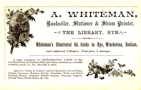 Edwin Henry Whiteman was born in Cambridge in 1857 [Birth registered in Cambridge during the 2nd Quarter of 1857]. Edwin Henry Whiteman was the eldest son of Jane and Edwin Whiteman senior (1834 -1876), a bookseller & stationer. Edwin's father, Edwin Whiteman senior, was born and raised in Udimore in Sussex, but sometime in the 1850s he moved to Cambridge, where, in 1856, he married Jane Fanny (Frances) Grout (born c1835 Cambridge). Mrs Jane Whiteman gave birth to two sons in Cambridge - Edwin Henry Whiteman (born 1857, Cambridge) and Albert Whiteman (born 1859, Cambridge). By 1861, Edwin Whiteman senior had returned to Sussex and by the mid 1860s he had established a bookshop and stationery business at 52 High Street, Hastings. Edwin Whiteman's business premises was known as "The Library". After settling in Hastings, there were several more additions to the Whiteman family - William (born 1861, Hastings) and Walter Thomas (born 1863, Hastings), Jane Lydia (born 1865, Hastings), George (born 1870, Hastings), Frederick (born 1873, Hastings), and twins, Frank and Ellen Whiteman (both born in Hastings during the 1st Quarter of 1876). The Whiteman Family - Professional Photographers in Hastings In 1866, Godbold & Co., a firm of photographers, opened a branch establishment at Mr. Whiteman's Library, 52 High Street, Hastings. Around 1868, Edwin Whiteman senior purchased the studio at 52 High Street from Messrs. Godbold & Co. From this date Edwin Whiteman senior operated the studio at 52 High Street, Hastings, under his own name. On 13th October 1876, Edwin Whiteman senior died, aged 42. From this date, the Whiteman studio was run by his widow Mrs Jane Whiteman and her three photographer sons - Edwin Henry Whiteman (born 1857, Cambridge), William Whiteman (born 1861, Hastings) and Walter Whiteman (born c1864, Hastings). In 1876, Edwin Henry Whiteman married Annie Wilkinson (born c1857 Woodchurch, Kent ). [ Marriage registered in Hastings during the 4th Quarter of 1876 ]. In the early years of their marriage, Edwin and Annie Whiteman produced two daughters - Grace Annie (born 1876, Hastings) and Lily (born 1879, Hastings). At the time of the 1881 census, Edwin Henry Whiteman was living with his wife and two young daughters at 7 Carlton Terrace in Egremont Place, Hastings. In the 1881 census return, Edwin Henry Whiteman is described as a "Photographer", aged 24. By 1887, Edwin Henry Whiteman, Mrs Jane Whiteman's eldest son, had become the proprietor of his mother's studio at 52 High Street, Hastings. By this date, Edwin had fathered two more daughters - Gladys May (born 1884, Hastings) and Edith (born 1887, Hastings). By 1890, Edwin H. Whiteman had sold the studio at 52 High Street, Hastings, and, with his wife and four daughters, moved to the small historic town of Rye, 9 miles north-east of Hastings . Edwin Henry Whiteman - Photographer in Rye