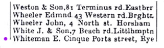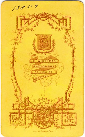 Edwin Henry Whiteman moved to Rye, Sussex around 1890. Edwin Henry Whiteman established a photographic studio at Landgate in Rye. Annie Whiteman gave birth to a son in Rye during the First Quarter of 1890. The boy was named Edwin Henry Whiteman, after his father. Edwin Henry Whiteman operated the photographic studio at Landgate, Rye from 1890 to 1894, . When the 1891 census was taken, Edwin Whiteman, his wife Annie, and their five children were living at 15 Ferry Road, Rye. On the census return, Edwin Whiteman is recorded as a "Photographer", aged 34. By 1894, Edwin Henry Whiteman had opened a new studio in Cinque Ports Street, Rye. The 1901 census records Edwin Whiteman and his family in Cinque Ports Street, Rye. On the census return, Edwin H. Whiteman is described as a "Photographer", aged 43. By this date, Edwin and Annie Whiteman's two eldest daughters were in domestic service and living away from home; Lily Whiteman was working as a housemaid in Tunbridge Wells, Kent, and twenty-one year old Lily Whiteman was employed as a nurse by a family in Bexhill. There had been three more additions to the Whiteman household since the last census - a daughter name Philly Whiteman had arrived in 1892, Ernest Edward Whiteman, Edwin's second son, was born in 1895 and the birth of Ethel Whiteman, the youngest member of the family, had been registered in Rye during the 1st Quarter of 1898. Edwin Whiteman was bringing up six children at his house in Cinque Ports Street, Rye. Only fourteen year old Edith Whiteman, who was employed as a clerk by a local jeweller, was contributing to the family's finances. A decade later, five of the children were living at Edwin Whiteman's house in Cinque Ports Street, Rye. Edwin's youngest daughter Ethel Whiteman was still at school, but three of Edwin Whiteman's children were in employment; twenty-one year old Edwin Whiteman junior was earning his living as as a "fitter and turner" and Ernest Edward Whiteman was employed as a "Solicitor's Clerk". Eighteen year old Phillie Whiteman had found work as a jeweller's engraver. Edwin Henry Whiteman worked as a photographer in Cinque Ports Street until around 1913. The following year, Edwin Henry Whiteman moved his studio to Winchelsea Road, Rye, where he worked as a photographer until his death in 1917. Edwin Henry Whiteman died in Rye on 6th February 1917 at the age of 59. The cause of death was given as "cirrhosis of the liver". |