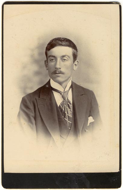 [ABOVE] A cabinet portrait of a young man, photographed by Edwin Whiteman of Rye (c1900). As with the other cabinet cards in this row of portraits, the photograph has been blind-stamped in the bottom right-hand corner with the photographer's credit "E. Whiteman, Rye, Sussex". Other portraits taken by Whiteman carry the words "Cinque Ports Studio Rye". |