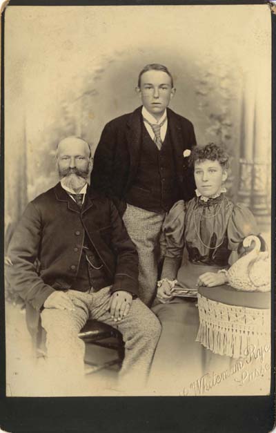[ABOVE] A family group portrait of a father with his two grown-up children, photographed by Edwin Henry Whiteman at his Rye studio (c1900). The young woman in this studio portrait was photographed years later by Edwin Whiteman, but this time the portrait was taken "out of doors" on location. (See cabinet portrait on the right). |