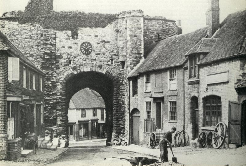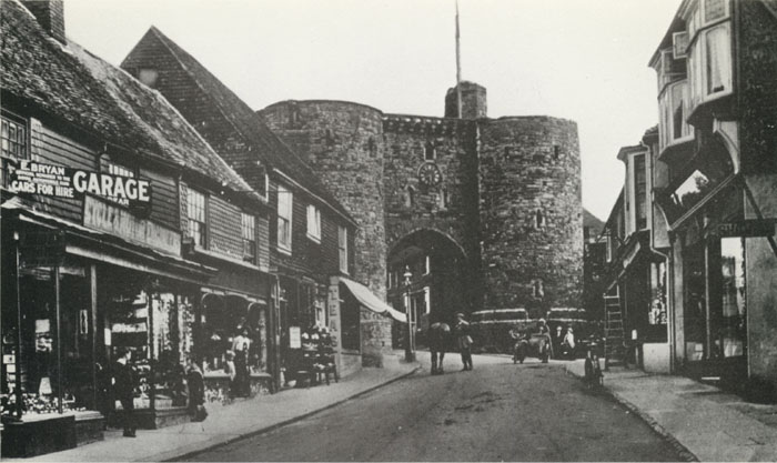 [ABOVE] A view of the shops in the Landgate area, photographed in 1914. The Landgate, a stone gateway built in Rye in 1329, can be seen at the end of the street. This road, which approached the Landgate from the north, was known as King Street in the period 1858-1890. Around the time that Edwin Whiteman arrived in Rye in 1890, the name of the street reverted back to the old name of Landgate. On the left of the picture is the business premises of E Bryan & Co., Cycle and Motor Car Engineers. The founder of the firm was Edward Bryan (born c1853, Wolverhampton), a cycle maker who established a cycle store in Landgate around 1890. By the time this photograph was taken in 1914, Bryan & Co. had opened a garage in Fishmarket Road, Rye. |