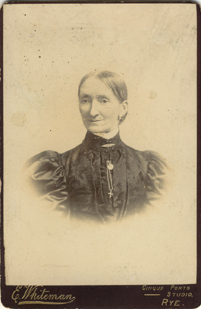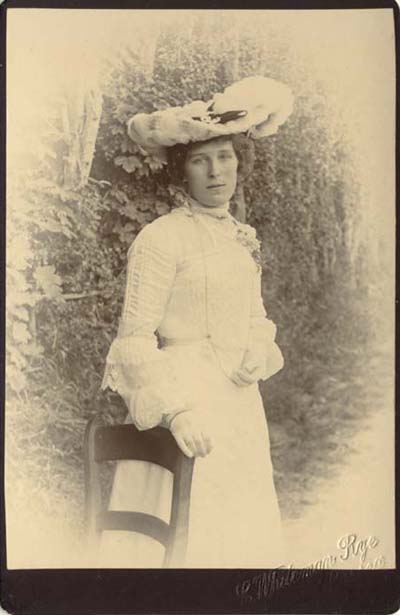 [ABOVE] A cabinet portrait of a young woman, photographed on location by Edwin Whiteman of Rye (c1907). This young lady was photographed a few years earlier by Edwin Whiteman in a studio setting, when she posed for a family portrait with her father and brother. (See the family group portrait on the left). |